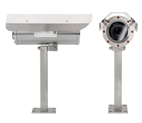 The allowed ambient temperature range of the RoughCam IPQ1715 starts at -60°C and goes up to +120°C. This wide temperature range is possible thanks to our ptc-ceramic heaters. They ensure that the camera remains ice-free even at -60°C while it doesn't get too hot at higher ambient temperatures. In order to ensure safe use even at very high ambient temperatures we remove the primary cell and for extreme high temperatures we equip the cameras with the optional enclosure cooling system cool.Jacket.